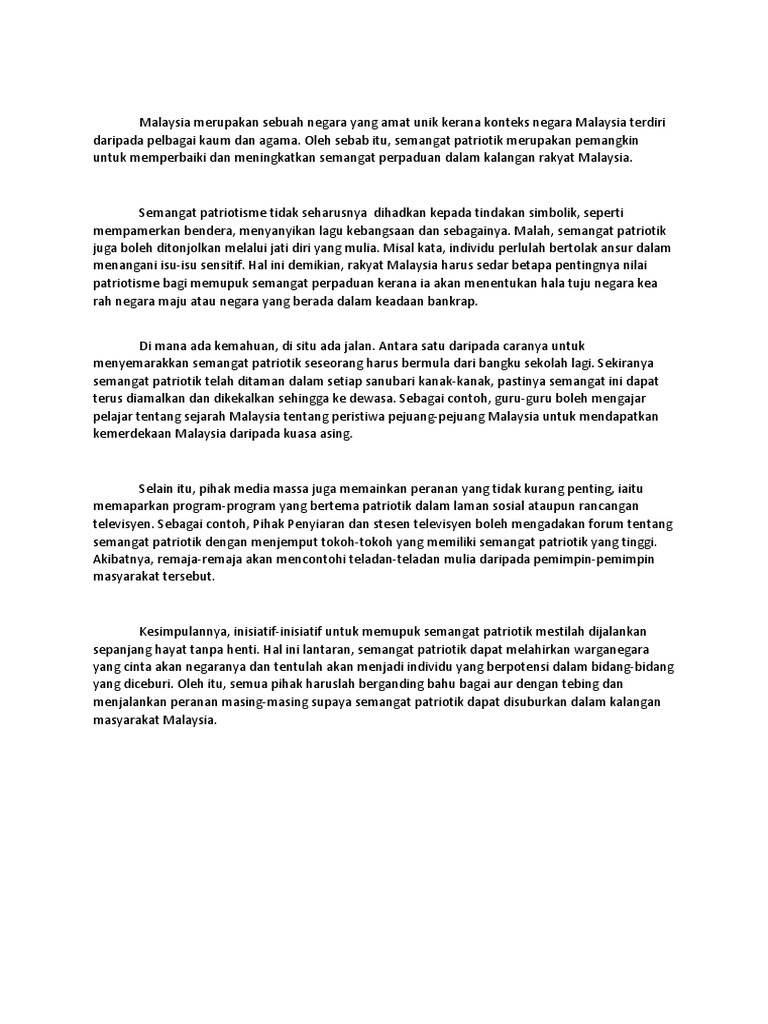 Menwujudkan kepentingan semangat patriotisme seperti Sambutan Bulan Kemerdekaan ianya pasti dapat memberi kesedaran kepada generasi muda. Semangat ini mampu mempengaruhi masyarakat untuk mengutamakan kepentingan negara berbanding dengan kepentingan diri. Up to 24 cash back Contoh Karangan A SPM DAN PT3.